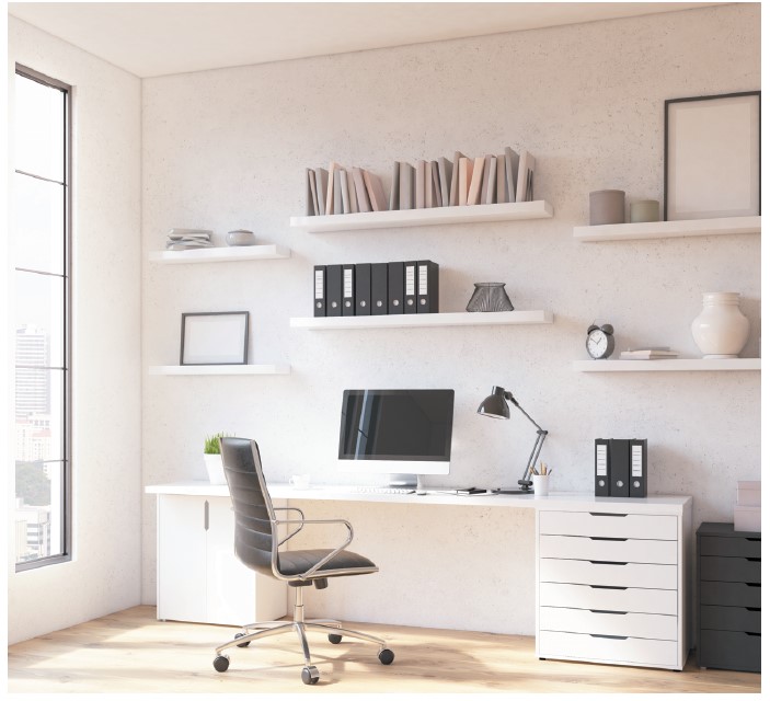Пространство домашнего офиса нужно тщательно спланировать. Выберите подходящее место для стола. Оно должно быть достаточно освещено, но проверьте заранее, чтобы на монитор не падали яркие блики из окна или от ламп. Определитесь с количеством розеток и местом их расположения. Важно избежать запутанных проводов и использования удлинителей. При необходимости стоит заменить проводку, чтобы в цепи не возникало превышения напряжения при одновременном использовании большого количества устройств.