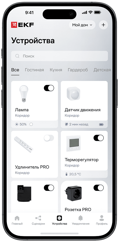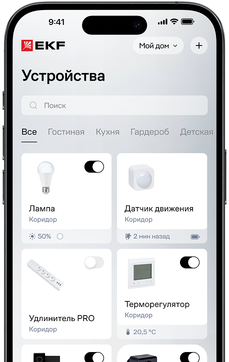 Создайте комфорт и безопасность без сложных настроек. Управляйте светом, климатом и электроприборами с телефона, где бы вы ни находились.